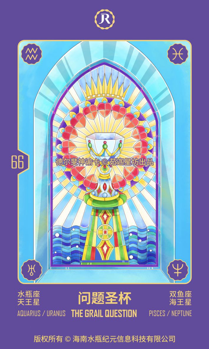 这是德卡的最后一张牌,它是唯一的一张不描绘任何人的牌。因此,这张牌也不再指向一个需要被发现的内在人物。这张牌想强调的是:德尔斐神谕卡的游戏主题是关于什么?是占星术?是占卜?是疗愈?都不是的,而是:关于提问(问题)本身!