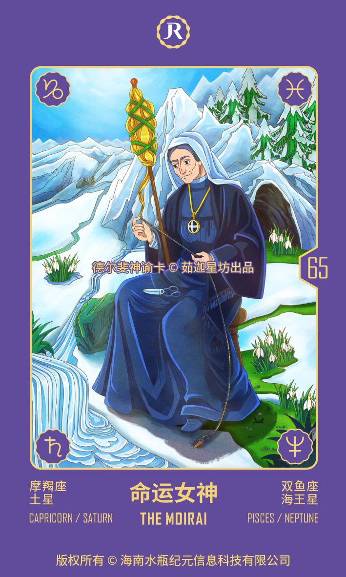这张图片展示了一位老妇人,她以古老的方式纺纱。这是以一个人的形象代表三个命运女神的母亲莫伊拉,命运三女神化作了莫伊拉正在搓线穿线所使用的旧式工具为人类纺织、衡量和剪断命运之线。一个与被分配给他的命运相协调生活并且相信莫伊拉的人,将会像她一样变得明智和睿智。画面中冰雪的融化象征他的灵魂的硬度、对生命的阻碍(土星)在海王星的消融之力的作用下逐渐软化。雪莲花的盛开象征新生命的春天开始了。