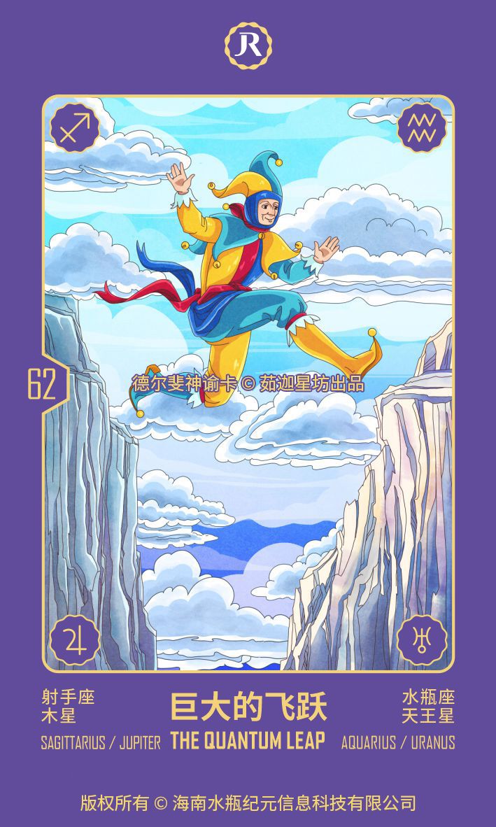 量子跃迁总是在小丑毫无知晓地跳跃时出现,不知道另一边是否真的有一个着陆点。因此,卡片的记忆和指示很简单:“跳!”释放自己!特别是把你从曾经获得的一切中解放出来,把你从曾经知道的一切中解放出来。曾今你所以为的“知道”只是肤浅的知识,真理的表层(蛋糕上的奶油),真理还有其他完全不同的层面。只有当你迄今为止所拥有的知识清楚地向你展示你实际上知道的有多少时,你才能进入这些不同的层面。只有从未知的安全中,你才能找到跳跃的勇气。