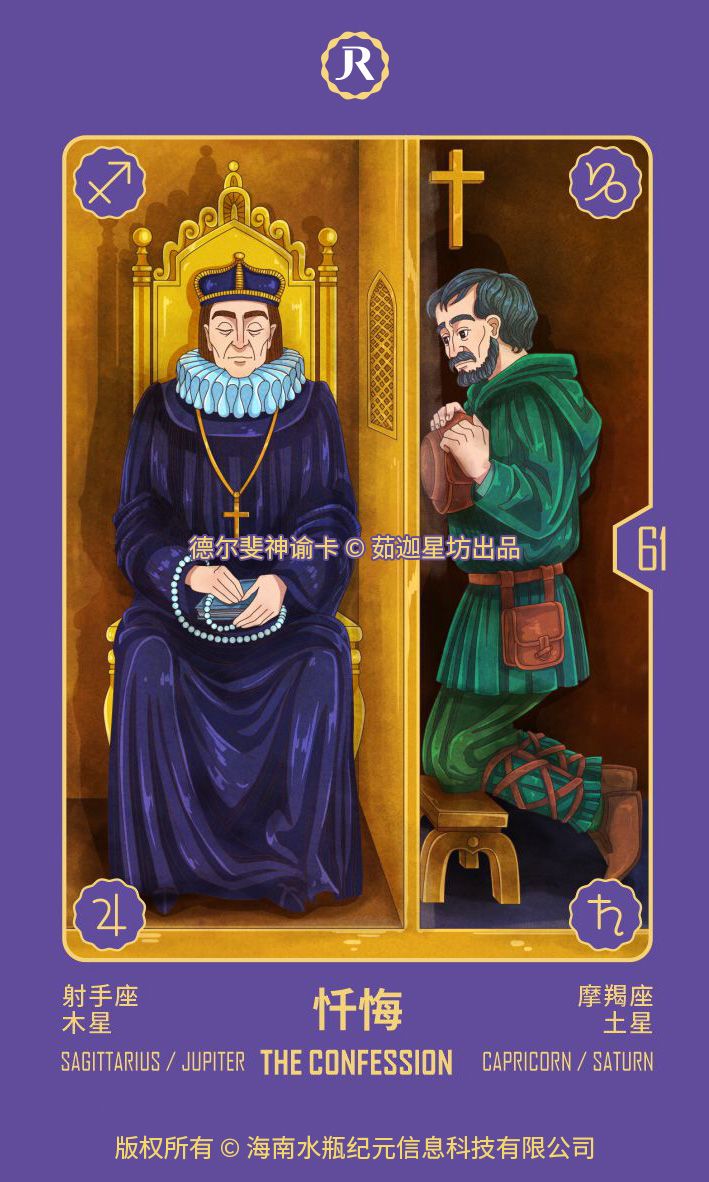 在你的灵魂上有一副重担,你本应将其转化为外在的忏悔。你需要进行告解。但你相信这样做会失去你的部分伟大,你自认自己是完全正确的。其他人会注意到,你的洞察力并没有你希望他们相信的那么深远。因此,你在忏悔的境地前停滞不前,不愿意接受你的命运。这可能会使你变得僵硬和陈旧。