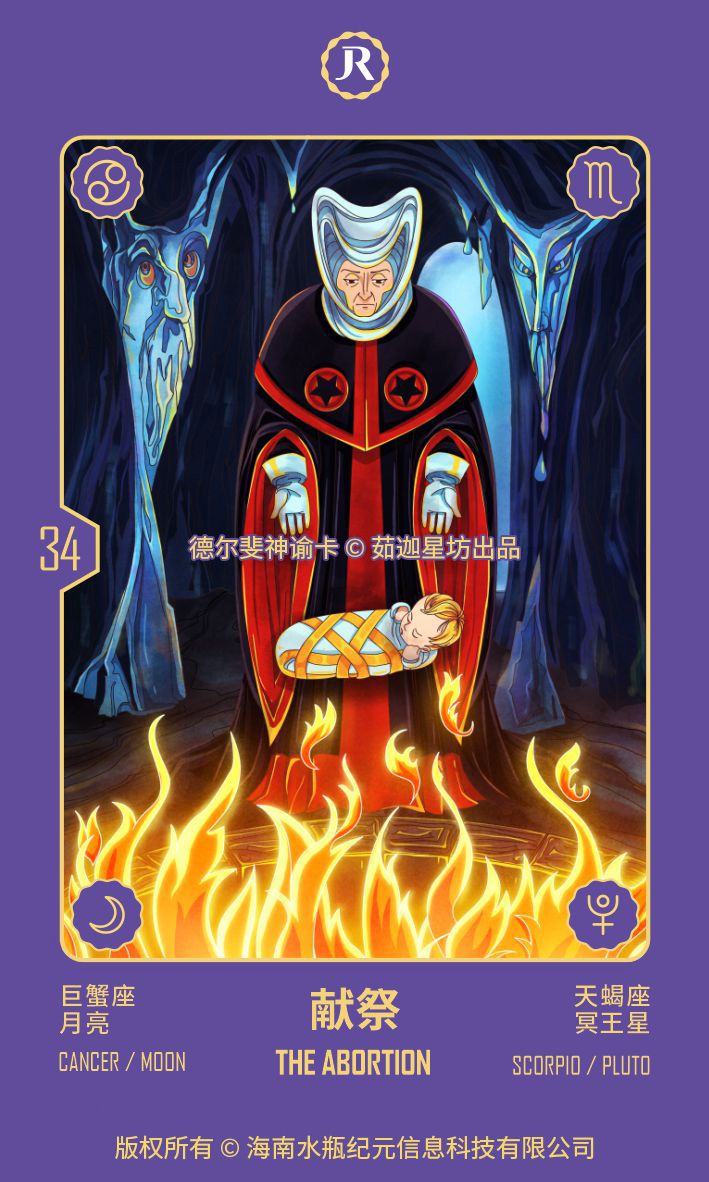 人为什么要出卖自己的灵魂?这到底意味着什么?我们的月亮/冥王星卡片的另一个名称是:“堕胎”。如果我们意识到在堕胎过程中发生了什么。传达天使给一个女人带来了这样的消息:你怀孕了,你有能力用你的月亮——你的女性力量——去接纳一个孩子。你被选中了,去承载生命的秘密,让它在你体内成熟和成长。女人拒绝向生命的孕育敞开(出于很多好的理由),并决定自己决定她的“生命”,并将其掌握在自己手中(“我的肚子属于我”)。她决定坚持自己的想法,并控制自己存在的进程。她决定支持冥王星(非生命之物),反对她内在的孩子——她生动的感觉。