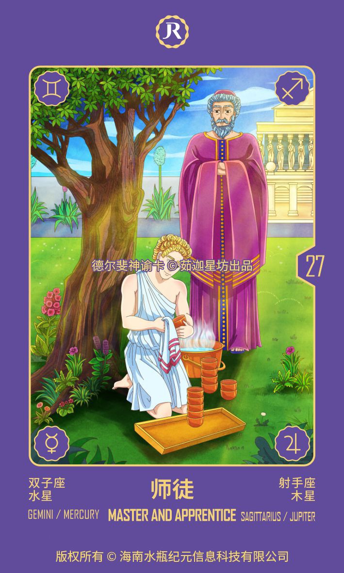 在画面中,一对在教堂花园前的师徒;身着木星色彩的大师,平静地看着他的学生。