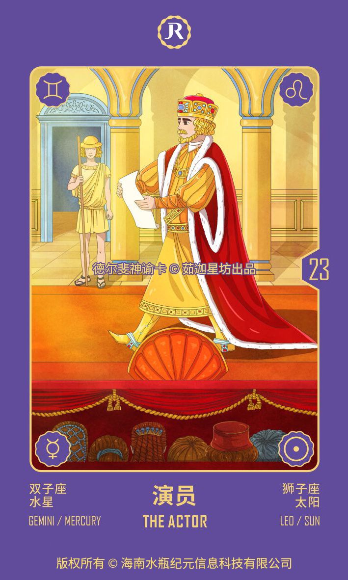 “演员”有两部分含义。一方面是关于“展示”,即国王必须展现出他是伟大的。另一方面是“玩”。结合起来,这张卡片的含义是:国王在剧院里上演一个角色。