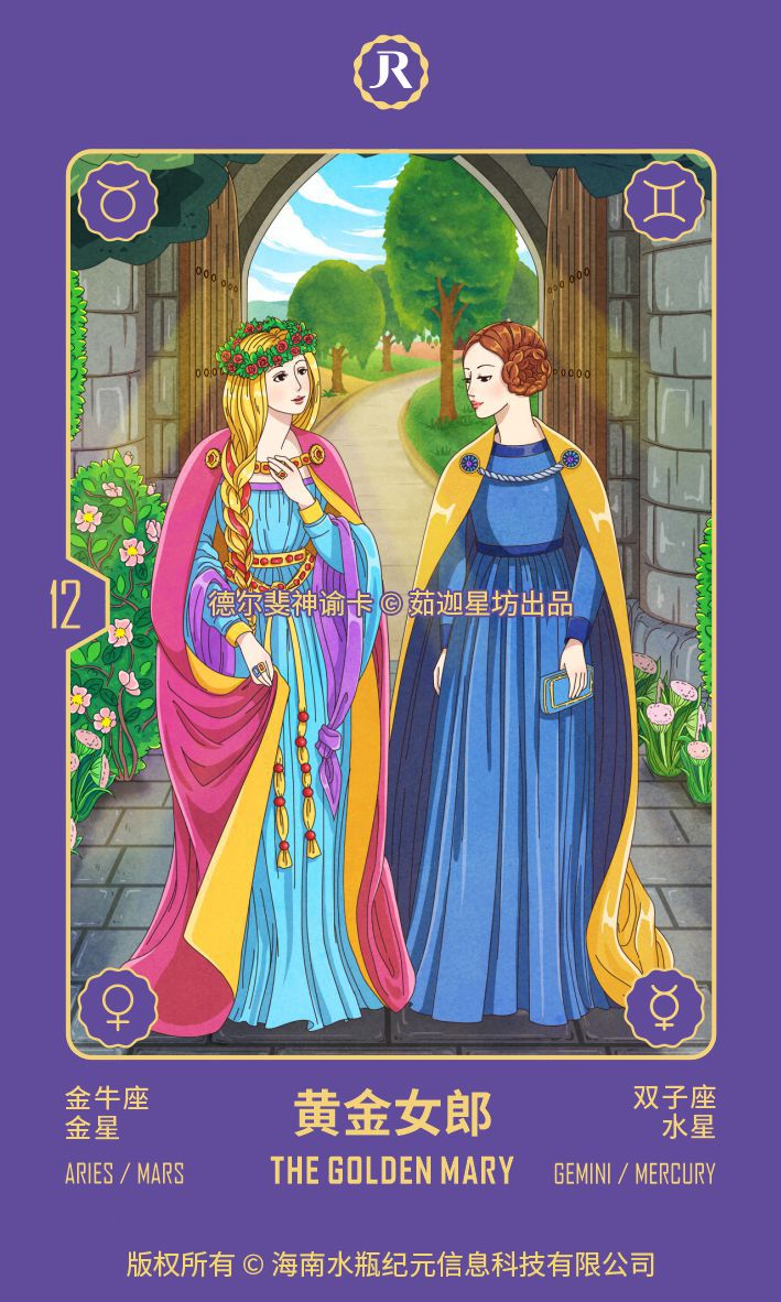 我们在现实生活中有时也会遇到这种现象,比如在一个咖啡馆里,两个女友,一个这样,另一个那样,似乎以一种神秘的理由而需要彼此。但德尔斐神谕卡的主题不是外在而是内在。因此,这张卡的主题是:我如何将我的女性魅力和价值展现在一个有利于我的光线下面?我如何展示我的价值?在这些外在努力的下面一层是我们可能失去吸引力的感觉(和恐惧),或者从未拥有过这样的吸引力。因此,可能会产生一种强迫,即我无法在内在找到的东西——自我价值,却试图通过外在属性以某种方式获得。