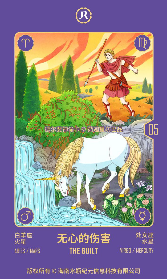 在日常生活中,这张卡片向我们展示了我们在归咎和投射中的固执。与试图保持无辜而避免行为的处女座不同,白羊座(凶手)向我们展示了一项行为已经完成,独角兽被击中,现在受伤躺在地上。我们伤害别人的次数有多少,而我们的解释和道歉的链条(正是这链条将我们与受害者绑定)是无限长的:“我没有看到你,你为什么要挡我的路,我要不是……如果你没有,我就不会……”,“我的行为只是自卫……”等等。