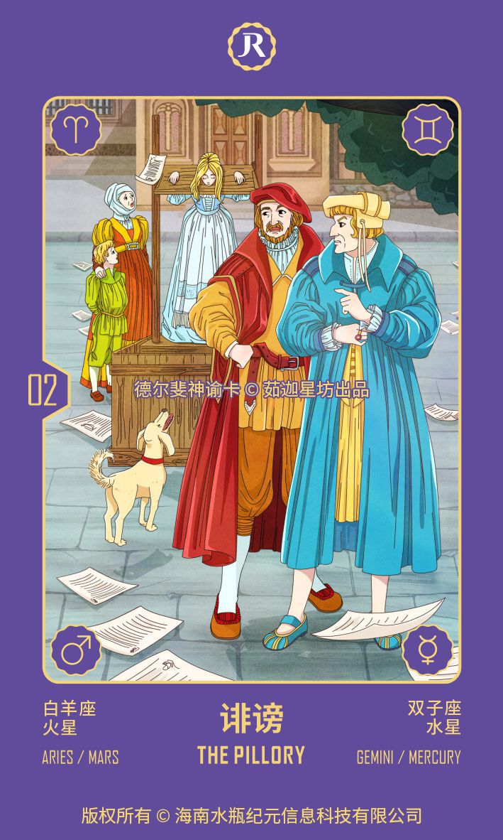这张卡描绘的是一个三向星座的呈现。因为双子本身就是一个双重人格的统一体(这也是它被称为“双子”的原因),这个双重人格遇到了第三人的时候,他们需要用言语来贬低对方抬高自己,这可以让他们自我感觉良好。他们在这里进行的是主题是“交谈”而不是“争吵”(争吵的主题是另一张卡:分歧),是为了贬低第三方而进行的信息交流。