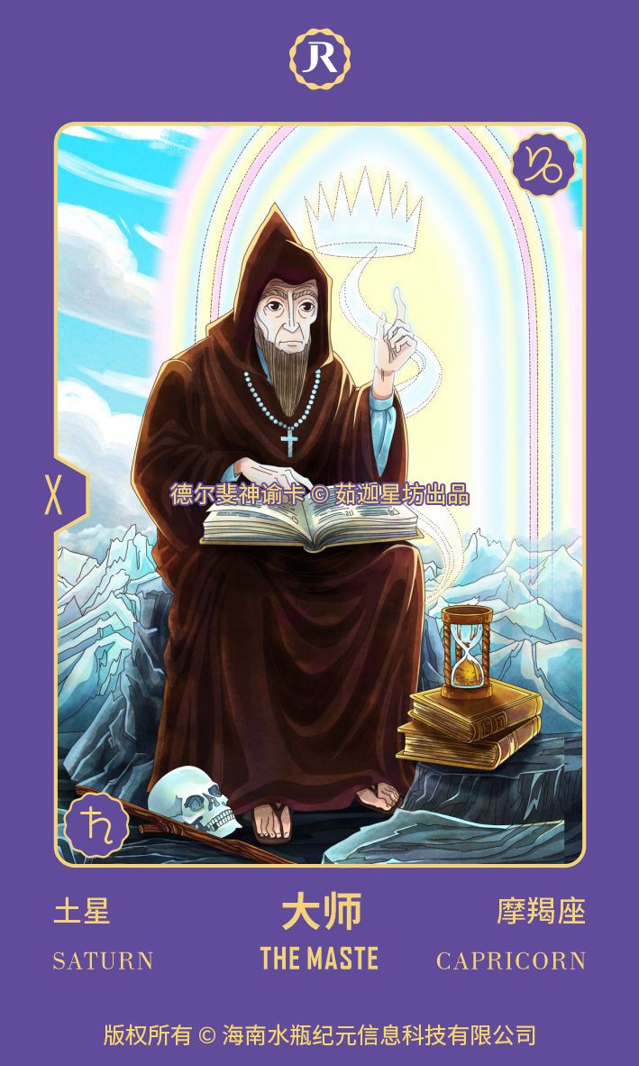 在一个寒冷、清澈的高山景观中,坐着一位老人。他举起食指,指向一本古老法典中的几行文字。仿佛他想说:“听我说,承认你的法则。你不是无缘无故来到这里的。”在他身后,有一扇带有王冠的门锁着。那是通往客观世界的大门,他守护着这个门槛。门槛后面是人类在另一个王国中的国王,就像国王牌所传达的那样。但在此之前,必须理解死亡(骷髅头)和时间(沙漏)。这位老人虽然严厉而坚硬,但从他的面容中可以感受到对那些没有承担责任的人的同情。