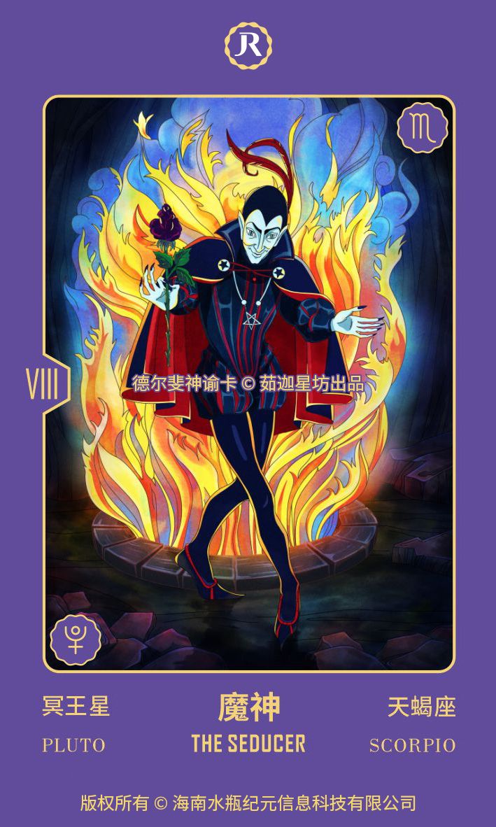 诱惑者以 梅菲斯特的形象呈现。他向观者鞠躬,他手中拿着一朵黑玫瑰,这是大自然无法孕育的产物,只有人类才能通过一个想法将其实现。整个画面以阴暗的颜色为主,这些颜色代表了这个人物具有神秘属性的象征。在背景中,有从地下深处喷涌出的冷紫色火焰,它象征着人类从底层汲取的力量。这是一团冷酷的火焰,因为它不能温暖心灵。