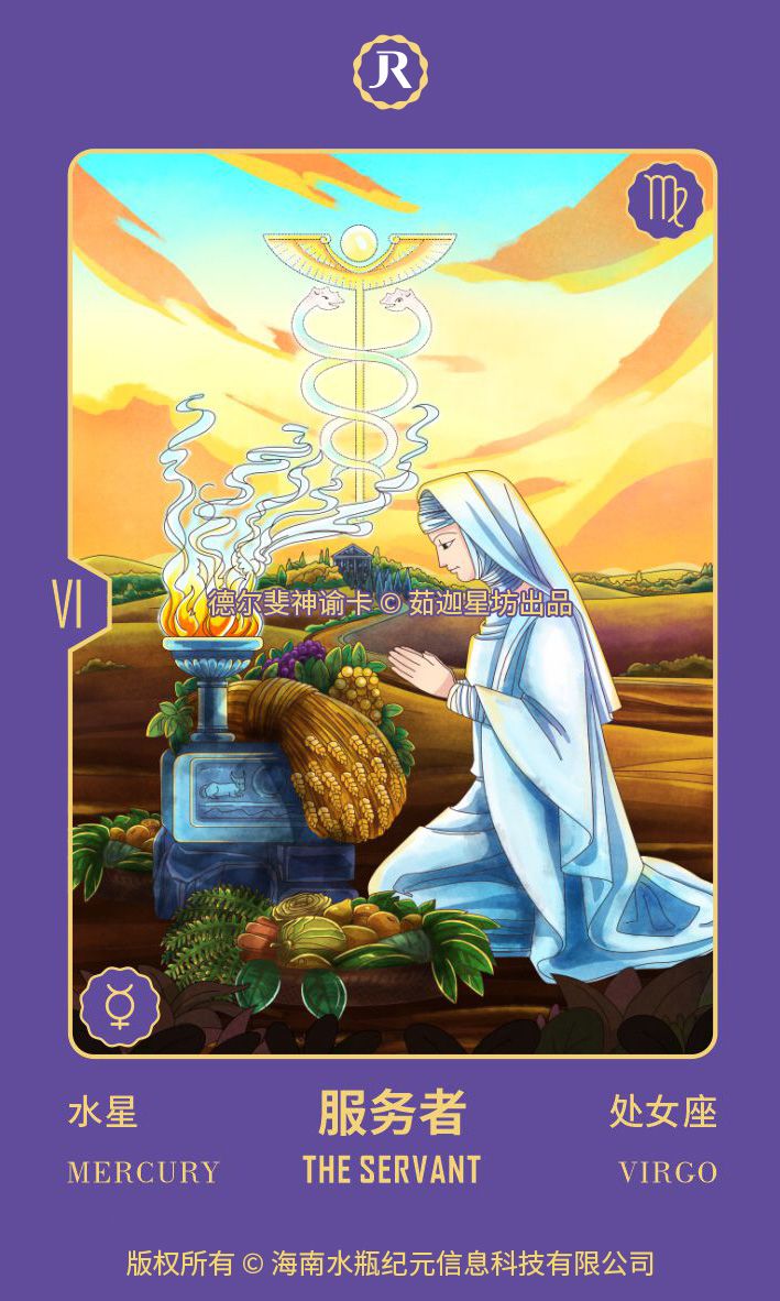 她身着白色的无暇之服,象征她的纯真,空气中的Caduceus之杖(带有双螺旋蛇和翅膀造型的权杖,它有一个更通俗、流传更广的名称:赫尔墨斯之杖)象征调控和净化阴与阳、女性与男性、精神与物质,而这些必须由处女之人来完成。
