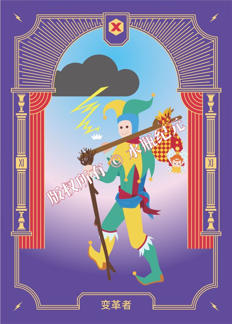 国王的布偶毫无生气地挂在小丑的包袱上,小丑不再需要这位用自我的游戏统治人民使人民不自由的国王。小丑轻松愉快地走向不确定的未来。思想的闪电在他的上方明亮照耀,预示着自发性和惊喜。