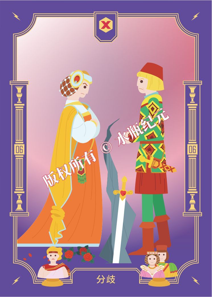 男人和女人之间出现了裂痕。大地被王者之剑劈开,象征关系的被打破。天空被两者周围的侵略性能量染成了红色。女人抱紧双臂,闭上眼睛,坚决的抵制和拒绝。男人愤怒地握紧拳头,他完全有能力挥出重拳。玫瑰,爱情的象征,被无视地踩在脚下,凋零破碎。