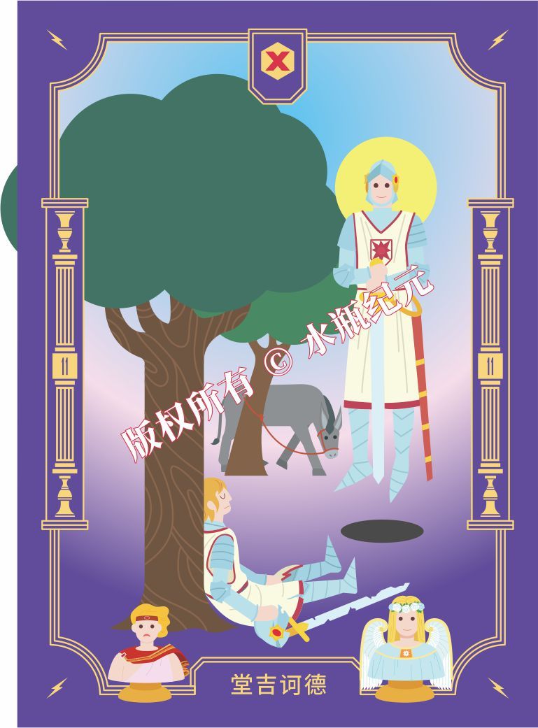 一个战士靠着一棵树睡着了。在梦中,他是一个光彩夺目的骑士,勇敢的斗士。如果更仔细的看,这位沉睡者的盔甲已经相当破旧,他的剑也生锈且不锋利了。树后面等待着他的忠实驴子,因为一匹马对他来说太昂贵了。
