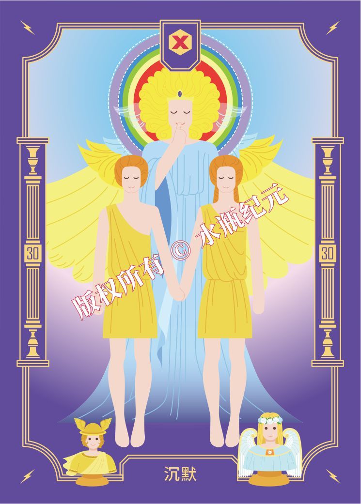 但天使在这里不是仅仅只想告诉你此刻你不再有机会参与世界表面的演出。她还有另一个责任:她是“秘密的守护者”。她要确保某些事情不能被公开讨论。在古希腊,许多进行过神秘仪式的人会被要求保密,将神秘殿堂内部的经历传播出去是被禁止的行为,违者将面临死刑。因为:神秘的仪式一旦被公开描述,它就失去了效力。所以这张卡片也想指出,你的某些经历过的事情不应该被说出来,你必须为自己保守秘密。魔法一旦被说出,不仅对被告知的人而言,也对于讲述者而言,魔法都不再有效了,所以,请保持沉默! 有些事情根本无法传达。它们的深度无法被带到表面。无论人们如何努力地想将海王星深处发生的事情提炼为水星的语言,人们都将因这个内在人物的沉默命令而无法简明扼要的表达,因此只能将千言万语简化为一句话:无法言说!