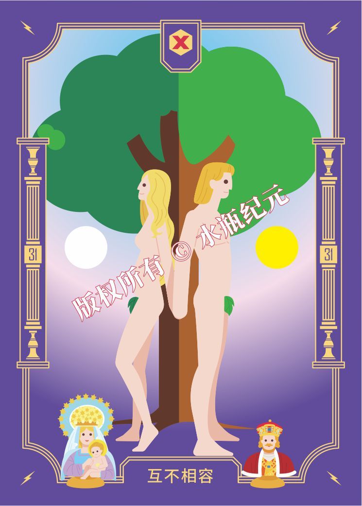 这张卡展示了人类灵魂的两大形象:阿尼玛和阿尼姆斯①,女性和男性(阴和阳),以及它们本质上的不相容性。 女性面朝着奉献之海(夜晚),男性面朝着上升之巅(白昼)。两者都梦想着能够将对方拉到自己的一边会是多么美妙。然而,他们之间存在着知识之树,分辨善恶,它将他们囚禁在它的束缚中。两人都因从天堂中偷吃了苹果而受到束缚,都必须知道对他们(以及其他人)来说什么是好的和正确的。然而:女性若被与她的情感割裂,就会处于男性的一边(变得男性化),而男性若被与他的权力割裂,他就会处于女性的一边儿会无力(变得女性化)。因此,每个人都必须明白,要走自己的路,别人的道路并不是自己的道路!