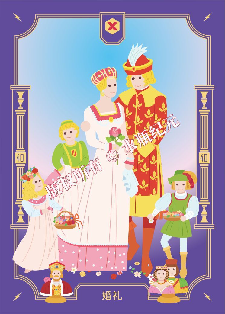 画面描绘的是一对刚从教堂出来的情侣,他们已互相做出了肯定的回答。这是他们生活中的高潮时刻,两个人幸福地展望着未来。孩子们撒着鲜花,因为这两个人都还沉浸在玫瑰的芬芳中。红色的地毯显示了平时不敢妄想的事情:两个EGO以特别的方式被提升——两个EGO现在是突出的——引人注目。