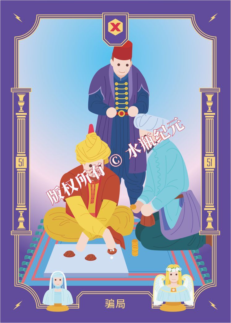 这张卡片表示:要么你现在正被愚弄,要么你尝试愚弄他人。而这两种情况中的哪一种更有利于你灵魂的救赎实际上并不清楚。