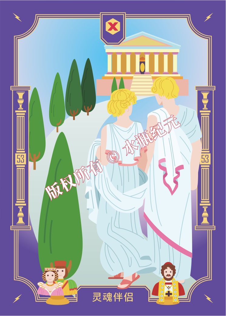 一男一女正走在通往寺庙的路上。为了表明他们彼此相属,他们穿着相似的衣服。在这条路上,你不必再强调性别差异,因为这里只有共同的更高目标才是重要的。寺庙被柏树环绕,这在古代是众所周知的圣地标志。众多的台阶象征着共同成长的许多阶段。要到达的寺庙是精神的顶点,它使一段关系变得富有知识和灵性。