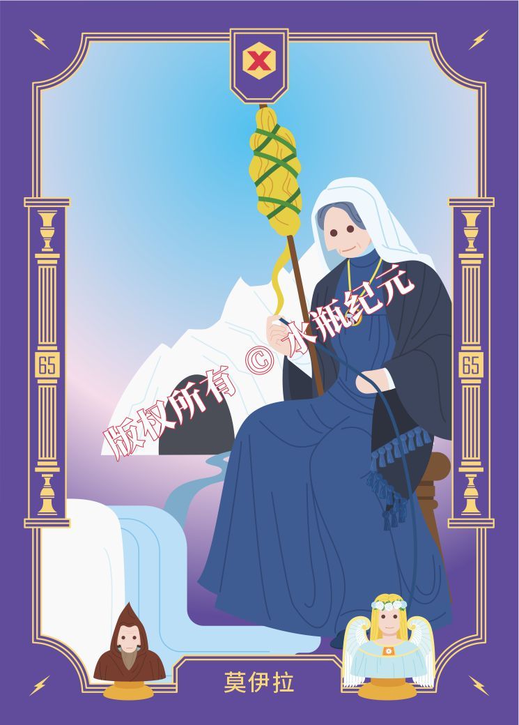 这张图片展示了一位老妇人,她以古老的方式纺纱。这是以一个人的形象代表三个命运女神的母亲莫伊拉,命运三女神化作了莫伊拉正在搓线穿线所使用的旧式工具为人类纺织、衡量和剪断命运之线。一个与被分配给他的命运相协调生活并且相信莫伊拉的人,将会像她一样变得明智和睿智。画面中冰雪的融化象征他的灵魂的硬度、对生命的阻碍(土星)在海王星的消融之力的作用下逐渐软化。雪莲花的盛开象征新生命的春天开始了。